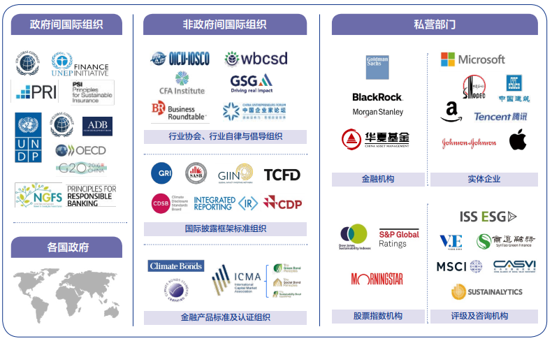 ESG理念和投資原則的迅速傳播和應(yīng)用,關(guān)鍵在于政府間國際組織、非政府間國際組織、公共部門和企業(yè)等多元主體共同參與。聯(lián)合國系統(tǒng)的13家機(jī)構(gòu)或倡議組織(包括UNCTAD、ITC、UNDP、UNEP、WBG、IFC、IMF、UN SSE、UNEP FI、PRI、PSI、PRB、UNGC 等),經(jīng)濟(jì)合作與發(fā)展組織(OECD)、二十國集團(tuán)(G20)等重要的國際多邊合作組織,都積極推動ESG政策的制定實行,以亞洲開發(fā)銀行(ADB)為代表的各地區(qū)開發(fā)銀行也紛紛加強(qiáng)對可持續(xù)領(lǐng)域的項目投資力度,推動地區(qū)可持續(xù)發(fā)展目標(biāo)的實現(xiàn)。在各類國際組織、政府監(jiān)管部門、金融機(jī)構(gòu)和實體企業(yè)等共同推動下,ESG逐漸走向標(biāo)準(zhǔn)化、國際化、體系化、全面化,成為了國際資本市場的一種“新規(guī)則”。