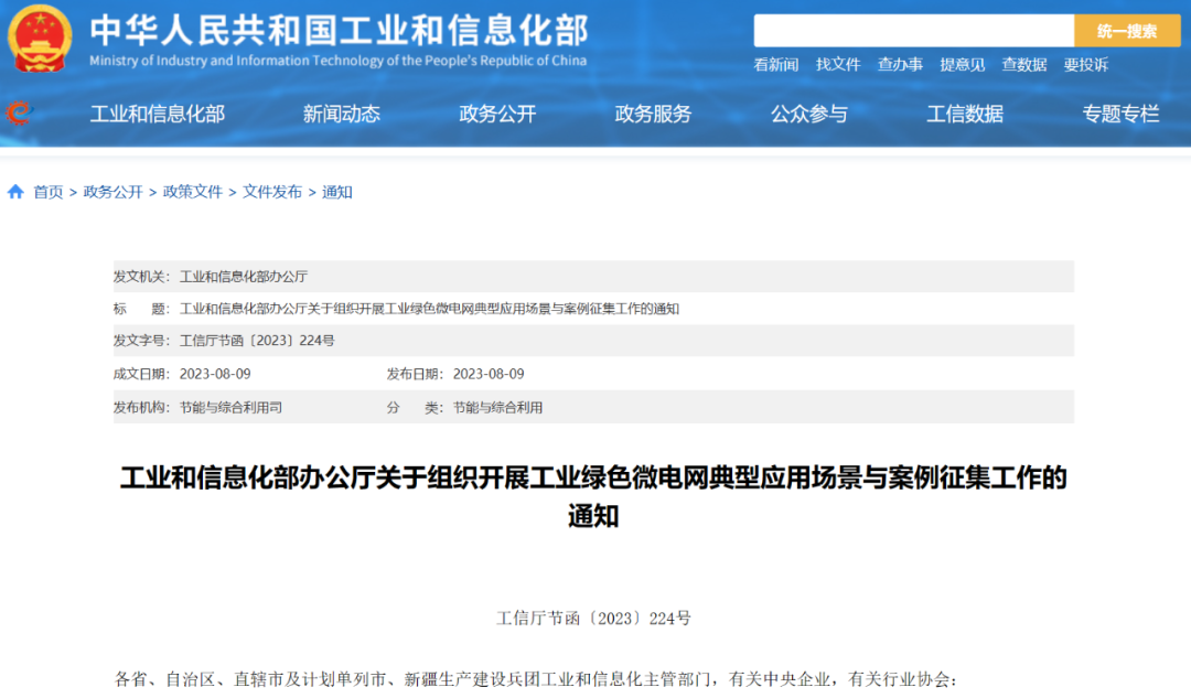 2023年8月9日,工業和信息化部發布《關于組織開展工業綠色微電網典型應用場景與案例征集工作的通知》《工信廳節函〔2023〕224號》,聚焦鋼鐵、有色、石化、化工、建材、機械、輕工、紡織、電子以及數據中心、5G基站等重點行業領域,征集一批集成應用分布式光伏、分散式風電、高效熱泵、新型儲能、氫能、余熱余壓利用、智慧能源管控等一體化系統的工業綠色微電網,為廣大工業企業和工業園區提供典型示范場景和實踐案例。