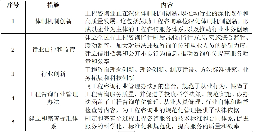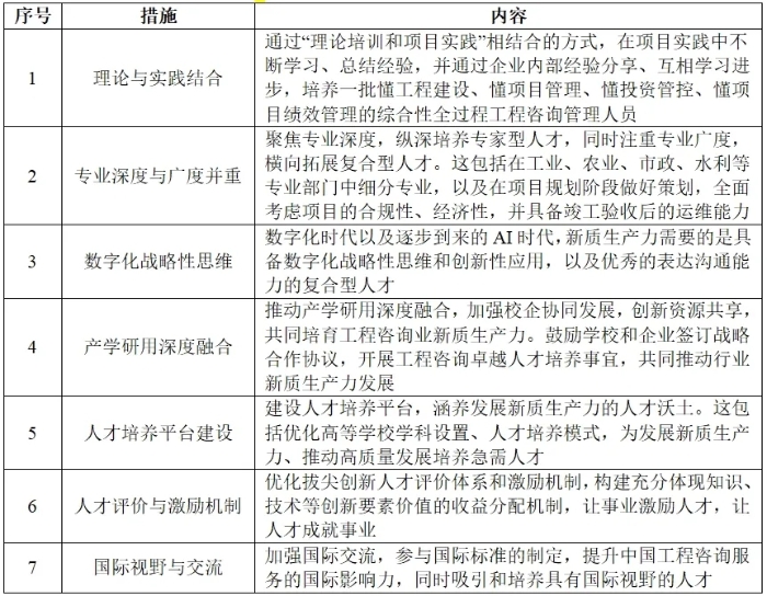 工程咨詢新質生產力培育和發展的 挑戰及建議 中咨公司2024年青馬研習第七小組 姜富華 胡曉偉 劉海若 等 編者按:高質量發展是新時代的硬道理,需要新的生產力理論來指導。2024年1月,習近平總書記在主持中共中央政治局第十一次集體學習時強調,“發展新質生產力是推動高質量發展的內在要求和重要著力點”。工程咨詢業屬生產性服務業,黨的二十屆三中全會的《決定》,作出了“聚焦重點環節分領域推進生產性服務業高質量發展”的戰略部署,為加快推動工程咨詢業高質量發展,明確了戰略方向,提供了根本遵循。新質生產力賦能工程咨詢,加快工程咨詢業高質量發展,不僅可以為現代化產業體系建設和企業發展提供更高效的智力支撐和決策參考,也有利于推動國家重大戰略、重大規劃、重大政策、重大工程落地實施,助力國家經濟發展和強國建設。 一、工程咨詢新質生產力內涵和特點 (一)工程咨詢新質生產力的內涵 以習近平同志為核心的黨中央準確把握歷史發展大勢和我國實際國情,作出了發展新質生產力的重大論斷和戰略部署,為我們在新時代新征程上進一步解放和發展生產力、推進和拓展中國式現代化提供了根本遵循和行動指南。新質生產力代表先進生產力的演進方向,是由技術革命性突破、生產要素創新性配置、產業深度轉型升級而催生的先進生產力質態。 圖1 新質生產力圖解 工程咨詢業是國民經濟的重要產業領域,在國家經濟社會發展中具有一定的戰略地位。多年來,在服務國家戰略需求、助力基礎設施建設、促進產業優化升級、推動經濟社會發展、提升國際競爭力等方面做出了重要貢獻。進一步提升工程咨詢創造智慧成果和高質量咨詢產品的能力,必須加強其自身的能力建設。新質生產力作為創新起主導作用的先進生產力,正在深刻改變生產方式和經濟增長模式。工程咨詢新質生產力本質是科技創新交叉融合突破所產生的根本性成果,其核心是通過創新引領,轉變發展理念,擺脫傳統發展路徑,探索符合新發展理念,促進工程咨詢業高質量可持續發展的新路徑。 (二)工程咨詢新質生產力特點 工程咨詢新質生產力與傳統生產力相比,其發展動力、發展形態和發展理念上有著本質的區別。新質生產力代表了最新的科技成果應用,技術更新迭代速度快,創新能力強,能夠快速適應市場變化,推出符合時代需求的高質量產品。具有高科技、高效能和高質量等特征。 1.高科技 新質生產力的形成過程實質上是科技創新成果向現實生產力轉化的過程,同時也是創造新產品、催生新產業、產生新價值的過程;新質生產力擺脫了要素驅動的數量型增長模式,知識技術密集、科技含量及其附加值高是其核心特征。工程咨詢作為知識密集型、附加值高產業,其新質生產力的培育和發展需始終強調高科技在發展中的引領地位,緊緊抓住科技創新的“牛鼻子”“衣領子”,充分發揮科技創新的增量器作用,加快關鍵核心技術和顛覆性技術有效供給,以科技創新成果助推產業發展升級,以新型生產方式促進新質生產力發展,實現工程咨詢業高質量發展。 2.高效能 全要素生產率的高效能、大幅度提升是新質生產力的核心標志;新質生產力在系列新技術突破和變革中,引領現有生產工具、生產方式、產業組織、產業形態變革調整,從而進一步激活勞動、資本、土地、科技、金融、人才、管理、信息、數據等生產要素活力,推動系列生產要素自由便捷流動、交叉組合、協作開發、融合裂變、持續優化,引起生產函數和生產關系的深刻變革,實現傳統產業升級轉型,探索生產要素投入少、資源配置效率高、環境資源成本低、經濟社會效益好的高效能發展路徑。工程咨詢新質生產力的發展意味著工程咨詢業生產效能的大幅提升、資源利用效率的大幅提高,由新技術、新產業激活已有技術與產業,促進工程咨詢業高端化和智能化。 3.高質量 高質量是社會各行業發展的核心主題,而新質生產力是社會各行業高質量發展的強大引擎,為社會各行業高質量發展提供強勁推動力和支撐力;實踐證明,過去依靠資源投入、圍繞“量的增長”為主的產業體系發展模式,已經難以為高質量發展提供新的增長動力;強調“質的提升”的新質生產力能夠實現新供給與新需求的高水平動態平衡,是一種更加注重科技創新、模式培育、場景拓展、產業協調、數字賦能、生態保護的生產力。依靠新質生產力來加快實現工程咨詢業結構調整和發展方式轉變,基于新質生產力形成新供給,提供更多高品質、高性能、更可靠、更安全、更環保的產品與服務,更好滿足有效需求,增強工程咨詢業發展的可持續性,進而形成推動高質量發展的現實解決方案。 二、工程咨詢新質生產力培育和發展面臨的挑戰 工程咨詢業是典型的知識密集型、輕資產和高附加值產業,其行業“質”的提升仍需新質生產力的助推,然而工程咨詢新質生產力的培育和發展不僅需要諸多創新科學技術、高端人才、龐大市場的支撐,更需要面臨當前以傳統模式為主的咨詢市場所帶來的挑戰。 (一)技術創新難度大及應用要求高 隨著科學技術的迅猛發展,技術更新換代的速度不斷加快,帶來了前所未有的機遇和挑戰。然而,伴隨著這種速度的加快,技術創新和研發的難度也在顯著增加。創新的門檻越來越高,不僅需要投入巨大的研究經費,還要