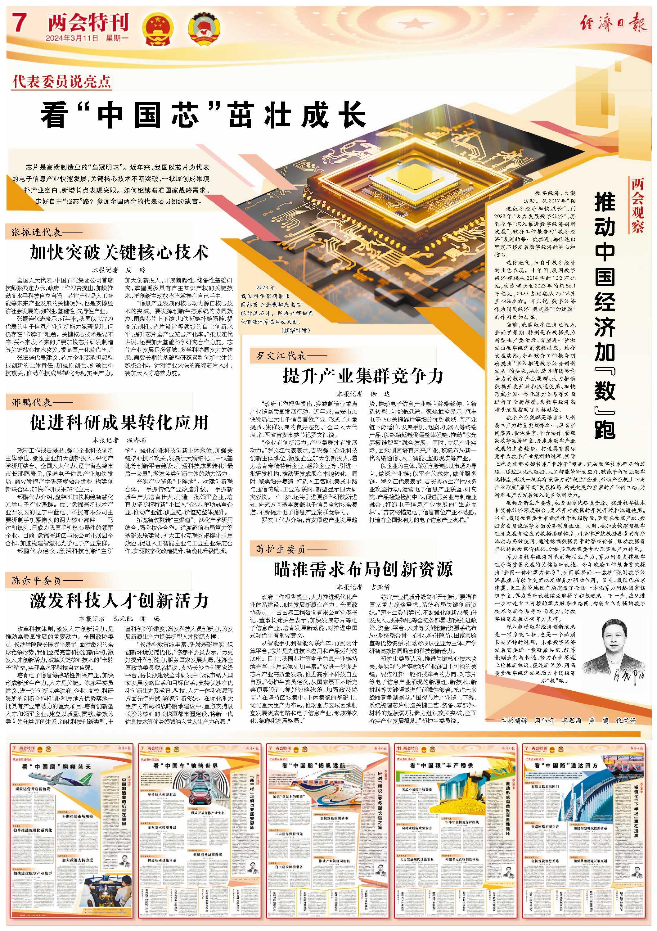 本文刊發于《經濟日報》2024年3月11日第7版兩會特刊 政府工作報告提出,大力推進現代化產業體系建設,加快發展新質生產力。全國政協委員,中國國際工程咨詢有限公司黨委書記、董事長茍護生表示,加快發展芯片等電子信息產業,培育發展新動能,對推進中國式現代化有重要意義。 從智能手機到智能網聯汽車,再到云計算平臺,芯片是先進技術應用和產品運行的底座。目前,我國芯片等電子信息產業鏈持續完善,應用場景更加豐富。“要進一步促進芯片產業高質量發展,推進高水平科技自立自強。”茍護生委員建議,從國家層面不斷完善頂層設計,抓好戰略統籌、加強政策協同。“在堅持區域集中、主體集聚的基礎上,優化重大生產力布局,推動重點區域因地制宜發展集成電路和電子信息產業,形成梯次化、集群化發展格局。” 芯片產業提質升級離不開創新。“要瞄準國家重大戰略需求,系統布局關鍵創新資源。”茍護生委員建議,不斷強化創新決策、研發投入、成果轉化等全鏈條部署,加快推進政策、資金、平臺、人才等關鍵創新資源系統布局;系統整合骨干企業、科研院所、國家實驗室等優勢資源,推動形成以企業為主體、產學研智高效協同融合的科技創新合力。 茍護生委員認為,推進關鍵核心技術攻關,是實現芯片等領域產業鏈自主可控的關鍵。要瞄準新一輪科技革命的方向,對芯片等電子信息產業涌現的新原理、新技術、新材料等關鍵領域進行前瞻性部署,搶占未來戰略競爭制高點。“圍繞芯片產業鏈上下游,系統梳理芯片制造關鍵工藝、裝備、零部件、材料的短板弱項,聚力組織攻關突破,全面夯實產業發展根基。”茍護生委員說。(經濟日報記者 吉亞矯) | |||||