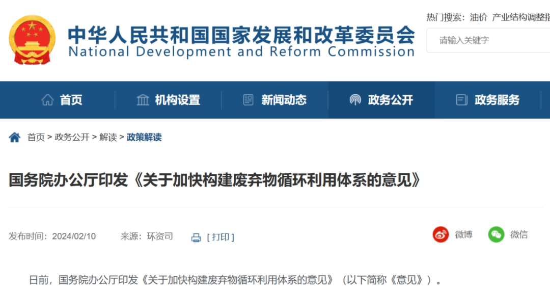 近日,國務院辦公廳印發《關于加快構建廢棄物循環利用體系的意見》(國辦發〔2024〕7號,以下簡稱《意見》)。《意見》聚焦生產生活各領域的廢棄物,分類施策,明確了推進廢棄物精細管理和有效回收、提高廢棄物資源化和再利用水平、加強重點廢棄物循環利用和培育壯大資源循環利用產業的重點任務和工作要求,指向明確、操作性強。《意見》的落地實施必將推動資源節約集約高效利用,對提升廢棄物循環利用水平和協同推進降碳、減污、擴綠、增長具有重要意義。 01、構建廢棄物循環利用體系對如期實現雙碳目標具有協同增效作用 “十四五”時期,我國生態環境保護進入減污降碳協同治理的新階段,協同推進減污降碳已成為我國新發展階段經濟社會發展全面綠色轉型的必然選擇。習近平總書記在黨的二十大報告中指出,“實施全面節約戰略,推進各類資源節約集約利用,加快構建廢棄物循環利用體系”,為新時期生態文明建設指明了方向、為加快發展循環經濟提供了根本遵循。廢棄物循環利用是循環經濟的重要組成,對減少資源消耗、提高資源利用效率、實現減污降碳協同增效至關重要。對此,以“雙碳”工作為引領,加快構建廢棄物循環利用體系,對于落實全面節約戰略、協同推進減污降碳、推進人與自然和諧共生的現代化具有十分重要的意義。 廢棄物循環利用協同降碳的作用主要表現在材料替代、流程優化、燃料替代、能效提升和產品循環等五個方面,并通過上述不同層級的利用方式實現多維度降碳。據中國循環經濟協會測算,2022年,我國通過推動廢棄物循環利用、大力發展循環經濟,共計減少二氧化碳排放約33億噸。隨著廢棄物循環利用在傳統領域不斷深化、在新興領域不斷拓寬,預計到2025年,發展循環經濟對我國碳減排的綜合貢獻率將超過30%,到2030年將超過35%。可見,加快構建覆蓋全面、運轉高效、規范有序的廢棄物循環利用體系,是積極穩妥推進碳達峰碳中和的重要舉措,是如期實現“雙碳”目標的有效支撐。 02、《意見》堅持系統觀念,高水平構建廢棄物循環利用體系,著力優化減污降碳協同增效路徑 《意見》注重系統施策,堅持問題導向,聚焦管理、回收、資源化和再利用等重點環節,立足生產生活各領域、全環節,系統性提出構建廢棄物循環利用體系的一攬子措施,高水平構建廢棄物循環利用體系。 產生環節,實施源頭精細化管理。加強廢棄物源頭管理是高水平構建廢棄物循環利用體系的重要基礎。研究表明,通過提升工業、農業等廢棄物的全過程管理水平,可平均減少約27.6%的碳排放。《意見》精準施策,圍繞我國工業源廢棄物管理制度不完善、建筑垃圾分類管理機制尚不健全等問題,有針對性地提出了規范廢棄物源頭管理的若干舉措:一是壓實廢棄物產生單位主體責任,完善一般工業固體廢棄物管理臺賬制度;二是通過分類收集、分類貯存,為工業固體廢棄物循環利用預留條件;三是分級分類整改固體廢棄物堆存場,督促貯存量大的企業加強資源循環利用;四是針對建筑垃圾回收面臨的堵點痛點,提出修訂建筑垃圾管理規定、完善建筑垃圾管理體系的新舉措,推動建立更加規范的建筑垃圾管理體系。 回收環節,注重進一步健全回收體系。廢棄物的收集與回收一頭連接著生產,一頭連接著資源化利用,是實現廢棄物循環利用協同降碳的橋梁。當前,我國農業廢棄物收集體系尚不健全、廢舊農用物資缺乏完善的處理機制、社會源廢棄物回收體系建設水平有待進一步提升。對此,《意見》提出,一是持續深化畜禽糞污收集處理利用、秸稈收儲運及廢舊農用物資回收工作;二是因地制宜健全農村廢舊物資回收網絡,積極發揮供銷合作系統回收網絡作用;三是聚焦“兩網融合”,深入推進生活垃圾分類網點與廢舊物資回收網點有效銜接,融合發展;四是深入實施生產者回收目標責任制行動,推動有條件的企業開展逆向物流回收。 利用環節,注重進一步提高利用質量。資源化和再利用是確保廢棄物再次進入物質循環,替代原生資源,實現廢棄物資源價值和降碳價值的關鍵環節,能充分發揮減少資源消耗和降碳的協同作用。目前,部分再生產品缺乏成熟的消納渠道、二手交易市場仍不規范不便利。對此,《意見》注重拓寬利用渠道,實現廢棄物資源化利用的協同降碳作用:一是拓寬大宗固廢綜合利用渠道、暢通利用消納渠道,加大復雜難用工業固體廢棄物規模化利用技術裝備的研發力度;二是推進汽車零部件、工程機械等傳統領域再制造發展,鼓勵探索對航空發動機、工業機器人等新領域的高端裝備再制造;三是研究制定網絡舊貨交易管理辦法,出臺信息清除方法相關規范,保障信息安全,研究解決舊貨轉售、翻新等服務或相關商品涉及的知識產權問題;四是提出廚余垃圾、農林生物質等能源化利用措施,通過燃料替代減少化石能源消費帶來的碳排放;五是加強余壓余熱的資源化利用,提高能源利用效率,減少對化石能源的消耗。 此外,《意見》還針對新興領域廢棄物循環利用進行了再部署、再推動。在雙碳背景下,新能源產業迎來新的發展機遇,產業規模迅速擴大,與新能源產業蓬勃發展同步的是退役動力電池、光伏組件、風機葉片等新興領域廢棄物的大量產生。實現退役設備循環利用,對促進全產業鏈協同降碳有重要意義。《意見》針對這一領域精準