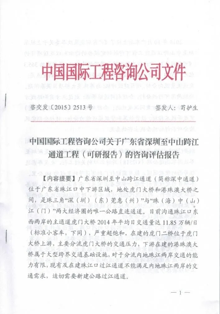 七年磨一劍,鏖戰(zhàn)珠江口。 飛架伶仃洋,天塹變通途。 6月30日,舉世矚目的國家重大工程深中通道正式建成通車。習近平總書記致信祝賀,并向參與規(guī)劃建設的全體同志致以誠摯問候。賀信中寫道:“深中通道是繼港珠澳大橋后粵港澳大灣區(qū)建成的又一超大型交通工程,攻克了多項世界級技術(shù)難題,創(chuàng)造了多項世界紀錄。全體參與者用辛勤付出、堅強毅力,高質(zhì)量完成了工程任務。這充分說明,中國式現(xiàn)代化是干出來的,偉大事業(yè)都成于實干!” 全長約24公里,總投資446億元的深中通道在環(huán)珠江口“A”字形交通主骨架上挺起關(guān)鍵一“橫”,成為全球首個集“橋、島、隧、水下互通”為一體的跨海集群工程。通車后,深圳至中山的車程從2小時左右縮短至30分鐘。自此,深中兩地“雙向奔赴”,攜手進入“一小時經(jīng)濟圈”,廣佛肇、深莞惠、珠中江三大珠三角都市圈聯(lián)結(jié)更加密切,推動了粵港澳大灣區(qū)高質(zhì)量發(fā)展加速駛?cè)肟燔嚨馈?/span> 世界最大跨徑(1666米)全離岸海中鋼箱梁懸索橋、世界最高通航凈空高度(76.5米)、世界最大海中錨碇(100萬噸)、世界橋梁最高顫振臨界風速(88米/秒)……深中通道創(chuàng)造了十多項世界紀錄,形成了“鋼殼-混凝土沉管隧道設計方法”等10項世界領(lǐng)先技術(shù)。獲得發(fā)明專利200余項、行業(yè)協(xié)會獎項數(shù)十項,并屢獲國際贊譽:2024年4月,深中大橋榮獲國際橋梁大會“喬治·理查德森獎”,深中隧道入選“全球隧道與地下工程領(lǐng)域50項標志性工程”。 這樣一項屢創(chuàng)紀錄、成于實干的超級工程背后,凝結(jié)著上百家參建單位、上萬名建設者的汗水和智慧,中國國際工程咨詢有限公司(以下簡稱“中咨公司”)便是其中一員。作為國家高端智庫和國內(nèi)規(guī)模最大的綜合性工程咨詢機構(gòu),中咨公司牢記“服務國家 貢獻社會”的初心使命,始終胸懷“國之大者”,助建“國之重器”,全程參與深中通道的建設論證,中咨人攻堅克難,勇于擔當,敢于創(chuàng)新,用實際行動詮釋了“公正、科學、可靠、敢言、多謀、慎斷”的中咨精神,為工程保駕護航,作出了重要貢獻。 使命召喚,責無旁貸 深中通道建設勢在必行 十年彈指一揮間,不負韶華不負己。2014年12月,受國家發(fā)展改革委委托,中咨公司開展《深圳至中山跨江通道可行性研究報告》(以下簡稱《可研報告》)的咨詢評估工作,評估重點包含以下方面:交通流量流向分析;項目建設時機;與港珠澳大橋項目關(guān)系問題;公鐵兩用可行性分析,合理利用通道資源;起訖點方案和路線方案;橋梁隧道方案同深度比選;合理確定車道數(shù)和橋梁(隧道)寬度等技術(shù)指標;投資估算和貸款償還能力分析;對社會穩(wěn)定風險分析和評估報告提出咨詢意見。 使命召喚,責無旁貸。中咨公司高度重視深中通道評估工作,迅速成立組建專班,由時任中咨公司副總經(jīng)理茍護生,原交通業(yè)務部主任佘湘耘,時任交通業(yè)務部主任助理姜青春,公路處處長(項目經(jīng)理)宋小云、公路處申培華、徐進、王春苗等,并邀請涵蓋隧道、橋梁、水運、鐵路、公路、投資估算等方面專家,共同組成項目組,全力以赴做好評估論證工作。 2014年12月,中咨公司接受委托開展評估論證工作。 2015年1月,中咨公司組織由工程院士、設計等組成的評估組,在深圳召開現(xiàn)場咨詢評估會,評估認為本項目的通航安全影響行業(yè)主管部門尚未批復,現(xiàn)有建設方案存在很大的不確定性,建議待有關(guān)通航等問題明確后,確定工程方案。 2015年8月,交通運輸部出具《關(guān)于深圳至中山跨江通道項目航道條件與通航安全影響評價的審核意見》(交水函〔2015〕590號),明確各航道通航凈空和相關(guān)技術(shù)要求。 2015年10月,《可研報告》編制單位根據(jù)中咨公司咨詢評估會意見和交通運輸部關(guān)于通航影響的批復意見,對交通量預測、通航審批執(zhí)行情況、工程實施范圍、投資估算及經(jīng)濟評價等內(nèi)容進行了進一步修改完善。 2015年11月,經(jīng)過評估組研究并進行再次評估后,中咨公司關(guān)于廣東省深圳至中山跨江通道工程(可研報告)的咨詢評估報告正式提交國家發(fā)展改革委。 至此,歷時近一年的深中通道咨詢評估工作順利完成,評估組從建設必要性與建設時機、交通量預測、與港珠澳大橋的關(guān)系、技術(shù)標準及通航標準、建設條件、建設方案、建設規(guī)模及建設工期、建設用地和用海、環(huán)境和生態(tài)影響分析、投資估算和資金籌措、經(jīng)濟評價、節(jié)能評價、社會評價、社會穩(wěn)定風險分析與評估、風險評估等十多個方面對項目進行全方位評估論證。