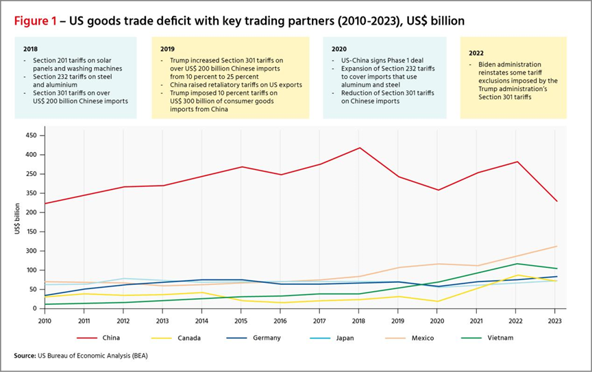 摘要 8月13日,辛里奇基金會(huì)貿(mào)易政策主管黛博拉·埃爾姆斯發(fā)表文章《特朗普如何塑造21世紀(jì)美國貿(mào)易政策》。文章指出,特朗普第一個(gè)任期以貿(mào)易為主導(dǎo),主要是將美國的國家和安全利益置于前沿和中心位置,將貿(mào)易作為美國外交和戰(zhàn)略政策的武器,但現(xiàn)在已“根植”在華盛頓兩黨、兩院和長期政策制定中。因此,在評(píng)估美國貿(mào)易和經(jīng)濟(jì)政策制定方式的急劇轉(zhuǎn)變時(shí),有五點(diǎn)轉(zhuǎn)變值得注意,其始于特朗普政府時(shí)期,并在拜登政府時(shí)期延續(xù)。 正文 隨著即將到來的美國總統(tǒng)選舉的民調(diào)結(jié)果愈發(fā)緊張,貿(mào)易觀察人士正密切關(guān)注唐納德·特朗普總統(tǒng)第一任期的經(jīng)驗(yàn)教訓(xùn)以及他重返白宮的計(jì)劃。特朗普代表著與過去美國貿(mào)易政策做法的徹底決裂,但他對(duì)國內(nèi)普遍情緒的利用程度足夠深,以至于他的許多政策在拜登總統(tǒng)任期內(nèi)得以延續(xù),而且無論誰入主白宮,他的政策似乎都將繼續(xù)下去。 貿(mào)易和經(jīng)濟(jì)是特朗普議程的核心。多年來,他對(duì)許多其他議題的立場(chǎng)發(fā)生了變化,但他始終專注于貿(mào)易。這是他擔(dān)任總統(tǒng)之前就存在的一個(gè)目標(biāo)。1987年,他在《紐約時(shí)報(bào)》上刊登了一整頁廣告,抗議當(dāng)時(shí)他認(rèn)為不公平的貿(mào)易行為,尤其是日本的貿(mào)易行為,他認(rèn)為這種行為削弱了美國。這已經(jīng)預(yù)示了他后來擔(dān)任總統(tǒng)時(shí)將采取的提高關(guān)稅的舉措。 特朗普就任總統(tǒng)后,貿(mào)易政策成為“特朗普政策指南針的四個(gè)要點(diǎn)”之一。事實(shí)證明,這一貿(mào)易指南針非常耐用,他和他的團(tuán)隊(duì)對(duì)美國政策做出的許多改變?cè)谒x開白宮后仍然有效。特朗普政府為重新定位美國長期政策制定而采取的立場(chǎng)現(xiàn)在似乎已“根植”在華盛頓的決策中。 在評(píng)估美國貿(mào)易和經(jīng)濟(jì)政策制定方式的急劇轉(zhuǎn)變時(shí),有幾點(diǎn)值得注意,這種轉(zhuǎn)變始于特朗普時(shí)期,并在拜登時(shí)期基本延續(xù)。這些包括 1.推動(dòng)白宮和行政部門的貿(mào)易政策; 2.重新使用單邊貿(mào)易工具; 3.重新制定貿(mào)易政策以適應(yīng)經(jīng)濟(jì)戰(zhàn); 4.與經(jīng)濟(jì)盟友的關(guān)系發(fā)生變化; 5.貿(mào)易利益與國家安全利益相混淆; 6.全球貿(mào)易體系多邊規(guī)則制定削弱。 特朗普在實(shí)施貿(mào)易議程方面之所以有效,得益于美國政治制度的特殊性。盡管美國憲法明確賦予國會(huì)管理稅收(以及關(guān)稅)的權(quán)力,但美國總統(tǒng)和行政部門在貿(mào)易和經(jīng)濟(jì)問題上仍有很大的回旋余地。自2017年1月,特朗普上任第一天單方面宣布退出跨太平洋伙伴關(guān)系協(xié)定(TPP)以來,美國貿(mào)易政策在很大程度上是由白宮推動(dòng)的,國會(huì)對(duì)此沒有施加太大壓力。 在拜登政府的領(lǐng)導(dǎo)下,貿(mào)易政策繼續(xù)由行政部門制定。拜登和特朗普一樣,繞過國會(huì)就貿(mào)易和經(jīng)濟(jì)問題發(fā)布了一系列行政命令。他進(jìn)一步將貿(mào)易政策制定權(quán)集中在白宮,而美國貿(mào)易代表辦公室(USTR)的作用則大大受限。美國商務(wù)部在印太經(jīng)濟(jì)繁榮框架(IPEF)中發(fā)揮了核心作用,該框架要求調(diào)整美國國內(nèi)政策流程,以允許美國商務(wù)部參與國際談判。 其次,特朗普選擇了里根政府的貿(mào)易律師兼高級(jí)貿(mào)易官員羅伯特·萊特希澤擔(dān)任美國貿(mào)易代表,萊特希澤對(duì)美國政治和政策制定體系有著豐富的知識(shí)和經(jīng)驗(yàn)。萊特希澤與彼得·納瓦羅和威爾伯·羅斯等其他顧問一起制定了許多美國法規(guī)和政策,這些法規(guī)和政策在很大程度上已經(jīng)擱置了數(shù)年甚至數(shù)十年。萊特希澤被任命為美國貿(mào)易代表后,得以重啟國內(nèi)工具,例如有關(guān)不公平貿(mào)易行為的第301條款或有關(guān)國家安全的第232條款。 同樣,拜登政府繼續(xù)使用了許多這些具體的工具。對(duì)鋼鐵和鋁征收的232條款關(guān)稅仍然有效,對(duì)中國產(chǎn)品的301條款關(guān)稅也是如此。拜登于2024年7月20日通過公告宣布了新的鋼鐵232條款申請(qǐng)。2024年8月,還對(duì)一組新的中國產(chǎn)品征收了301條款關(guān)稅。 特朗普最初貿(mào)易議程的第三個(gè)重要領(lǐng)域是對(duì)貿(mào)易政策目的的重大重新評(píng)估。301條款或232條款等工具被用來實(shí)現(xiàn)其目標(biāo),其根源在于美國正在經(jīng)歷一場(chǎng)經(jīng)濟(jì)戰(zhàn)。特朗普的論點(diǎn)被萊特希澤巧妙運(yùn)用和實(shí)施,他認(rèn)為過去的做法尤其是貿(mào)易協(xié)定的使用以及他們認(rèn)為過去政府未能妥善執(zhí)行這些協(xié)定的做法,加速了美國的衰落。 雖然拜登執(zhí)政期間大部分政策調(diào)整都得以實(shí)施,但特朗普的一項(xiàng)關(guān)鍵指標(biāo)被取消了。特朗普將雙邊貿(mào)易逆差的規(guī)模視為衡量美國是否從貿(mào)易中獲益的標(biāo)準(zhǔn)。與美國存在大量商品貿(mào)易逆差的國家被認(rèn)為采用了不恰當(dāng)?shù)馁Q(mào)易做法。 圖1和圖2