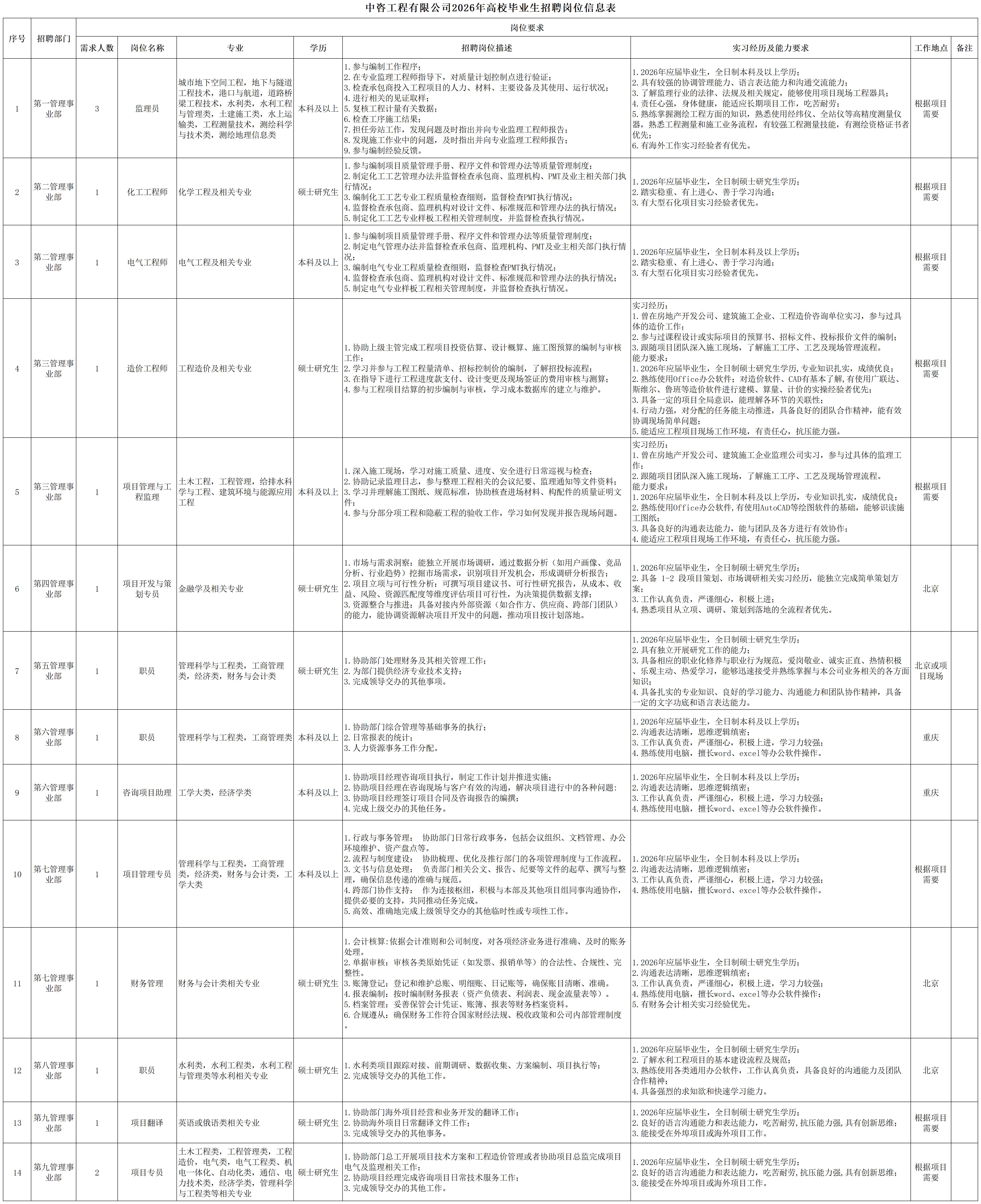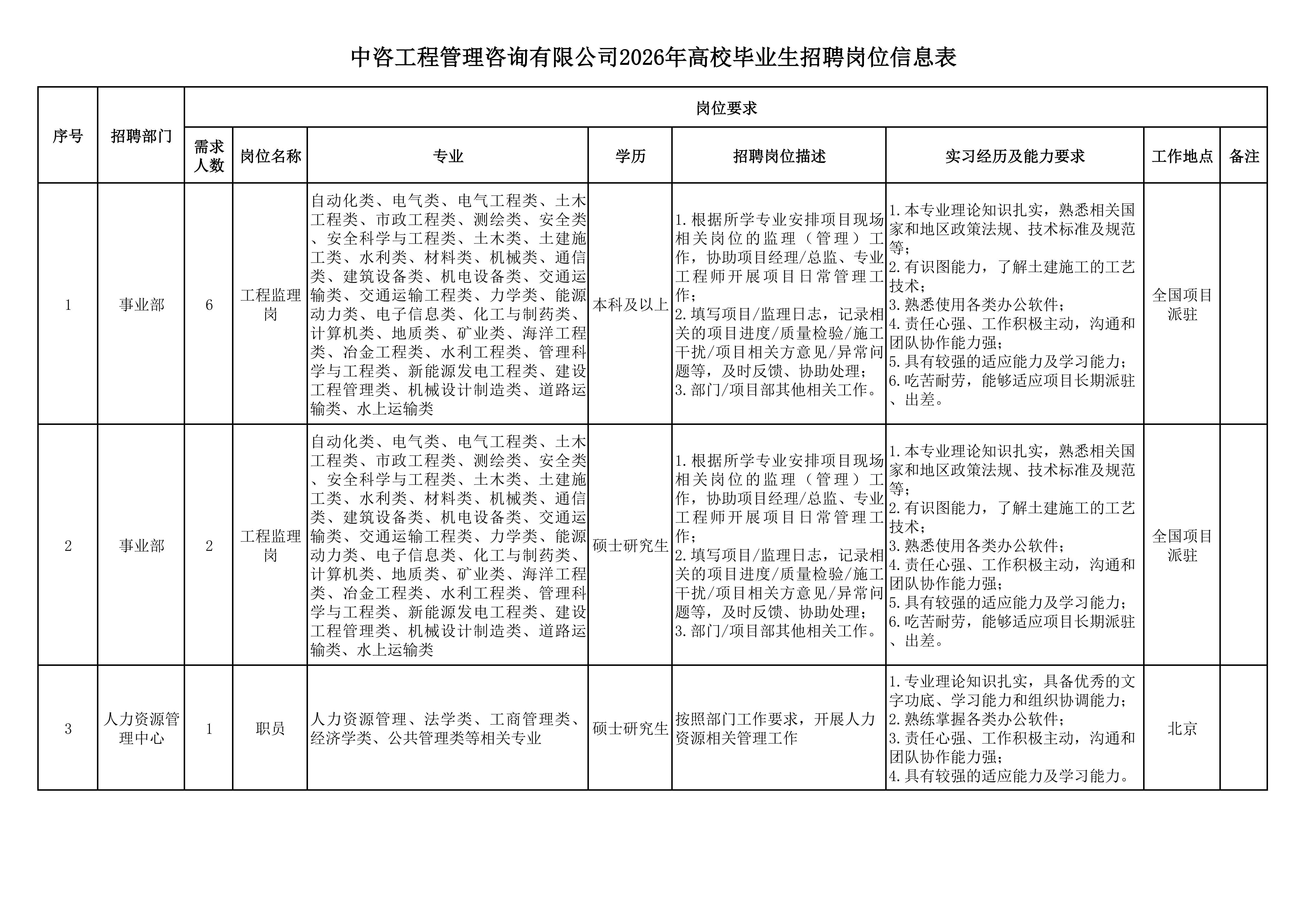 一、公司簡介 中咨工程管理咨詢有限公司(簡稱中咨管理)成立于1989年,是中國國際工程咨詢有限公司的核心骨干子公司,注冊資金1.55億元。現(xiàn)有各項資質(zhì)證書持證2800余冊,中高級職稱比例超50%。 中咨管理公司是國內(nèi)從事工程管理類業(yè)務(wù)最早、規(guī)模最大、行業(yè)最廣、業(yè)績最多的企業(yè)之一,具有工程咨詢甲級資信、工程監(jiān)理綜合資質(zhì)以及設(shè)備、公路工程、地質(zhì)災(zāi)害防治工程、人民防空工程等多項專業(yè)監(jiān)理甲級資質(zhì),并列入政府采購招標(biāo)代理機構(gòu)和中央投資項目招標(biāo)代理機構(gòu)名單。業(yè)務(wù)涵蓋工程前期咨詢、項目管理、項目代建、招標(biāo)代理、造價咨詢、工程監(jiān)理、設(shè)備監(jiān)理、設(shè)計優(yōu)化、工程質(zhì)量安全評估咨詢等項目全過程咨詢服務(wù),涉及房屋建筑、交通、石化、水利、電力、冶煉、礦山、市政、生態(tài)環(huán)境、通信和信息化等多個行業(yè)。業(yè)務(wù)遍布全國及全球近50個國家和地區(qū),累計服務(wù)各類咨詢管理項目超過1萬個,涉及工程建設(shè)投資近5萬億元。曾榮獲56項中國建設(shè)工程魯班獎、15項中國土木工程詹天佑獎、64項國家優(yōu)質(zhì)工程獎、23項中國鋼結(jié)構(gòu)金獎以及各類省級或行業(yè)獎項500余項。 經(jīng)過30余年的不懈努力,我們積累了豐富的工程管理經(jīng)驗,為各類工程建設(shè)項目保駕護航,“中咨管理”品牌成為行業(yè)的一面旗幟。我們崇尚簡單、包容、共享的理念,秉持創(chuàng)造價值、貢獻社會的使命和專業(yè)創(chuàng)造精品、價值成就客戶的核心價值觀,為成為全過程工程管理咨詢的領(lǐng)先者而奮斗。優(yōu)秀的你值得更好的平臺,加入我們,攜手共創(chuàng)新篇章! 二、應(yīng)聘條件 (一)2026年全日制本科及以上應(yīng)屆畢業(yè)生。 (二)年齡要求:本科生26周歲及以下(2000年1月1日后出生),碩士研究生30周歲及以下(1996年1月1日后出生)。 (三)在校就讀期間無在職工作經(jīng)歷,無社保繳納記錄和派遣落戶記錄。 (四)成績優(yōu)秀,人品端正,積極進取,愿與公司共改革、奮進。 (五)具備扎實的專業(yè)理論知識和良好的溝通能力,實踐能力較強。 (六)熟練使用各類辦公軟件。 (七)簡歷需注明出生日期、生源地(即入學(xué)前戶籍所在地)。 三、應(yīng)聘程序 發(fā)布招聘公告→簡歷投遞→簡歷篩選→筆試→面試→確定人選并公示→發(fā)放錄用通知。 四、崗位信息 五、報名方式 本次招聘報名采取在線填報方式進行:應(yīng)聘者請使用Chrome內(nèi)核瀏覽器(如:Chrome瀏覽器、360瀏覽器、百度瀏覽器、搜狗瀏覽器、UC瀏覽器等)登錄網(wǎng)站報名,網(wǎng)站鏈接:https://hcmcloud.ciecc.com.cn/recruit/#/index 或使用手機掃描二維碼: 中咨工程有限公司 一、 公司簡介 中咨工程有限公司成立于2010年,是中國國際工程咨詢有限公司(簡稱中咨公司)的控股子公司,由中咨公司和中國廣核電力股份有限公司合資成立。 公司作為中咨公司工程管理業(yè)務(wù)板塊的核心成員,主營業(yè)務(wù)為全過程工程管理(咨詢)服務(wù)業(yè)務(wù),包括全過程中的各節(jié)點業(yè)務(wù)(1+X),業(yè)務(wù)范圍涉及石化、核電、冶金、交通和民用市政等多個領(lǐng)域行業(yè)工程項目的前期咨詢及咨詢管理、勘察管理、設(shè)計管理、監(jiān)理、采購管理、造價咨詢、建造過程管理、項目管理(IPMT、PMC等)、項目代建和技術(shù)服務(wù)等。 公司以為國家、社會和股東創(chuàng)造價值為己任,以兩大股東提供的廣闊市場機遇和成熟先進的管理體系為發(fā)展驅(qū)動力,通過積極參與市場競爭,努力培育公司核心競爭能力,打造一支特別能戰(zhàn)斗的具有復(fù)合型人才的專業(yè)化隊伍,矢志發(fā)展成為具備承接大中型全過程工程管理(咨詢)服務(wù)業(yè)務(wù)能力的、具有國際競爭力的工程公司。 二、 應(yīng)聘條件 (一)2026年全日制本科及以上應(yīng)屆畢業(yè)生(部分崗位碩士研究生學(xué)歷),在校就讀期間無在職工作經(jīng)歷,無社保繳納記錄和派遣落戶記錄,學(xué)習(xí)成績優(yōu)良。 (二)良好的語言表達能力和溝通能力,執(zhí)行力強,學(xué)習(xí)能力強,協(xié)作能力強。 (三)身體健康,具有良好的職業(yè)道德修養(yǎng),具有較強的責(zé)任心。 (四)熟練使用常用辦公軟件,具有一定的文字功底。 (五)無違規(guī)違法記錄,無不良嗜好,身體素質(zhì)好,能吃苦耐勞,能承受較大的工作壓力。 三、 招聘程序 發(fā)布招聘公告→簡歷篩選→資格審查→綜合能力測評→面試→確定人選并公示→發(fā)放錄用通知→入職。 四、 崗位信息 五、 報名方式 本次招聘報名采取在線填報方式進行:應(yīng)聘者請使用Chrome內(nèi)核瀏覽器(如:Chrome瀏覽器、360瀏覽器、百度瀏覽器、搜狗瀏覽器、UC瀏覽器等)登錄網(wǎng)站報名,網(wǎng)站鏈接:https://hcmcloud.ciecc.com.cn/recruit/#/index 或使用手機掃描二維碼: 中咨海外咨詢有限公司 一、公司簡介 中咨海外咨詢有限公司是中國國際工程咨詢有限公司所屬二級子公司,于1988年成立,經(jīng)過30多年發(fā)展,為各級政府、企事業(yè)單位提供了萬余項咨詢服務(wù),在國內(nèi)咨詢領(lǐng)域具有一定知名度和較高信譽,具備較好的發(fā)展基礎(ch