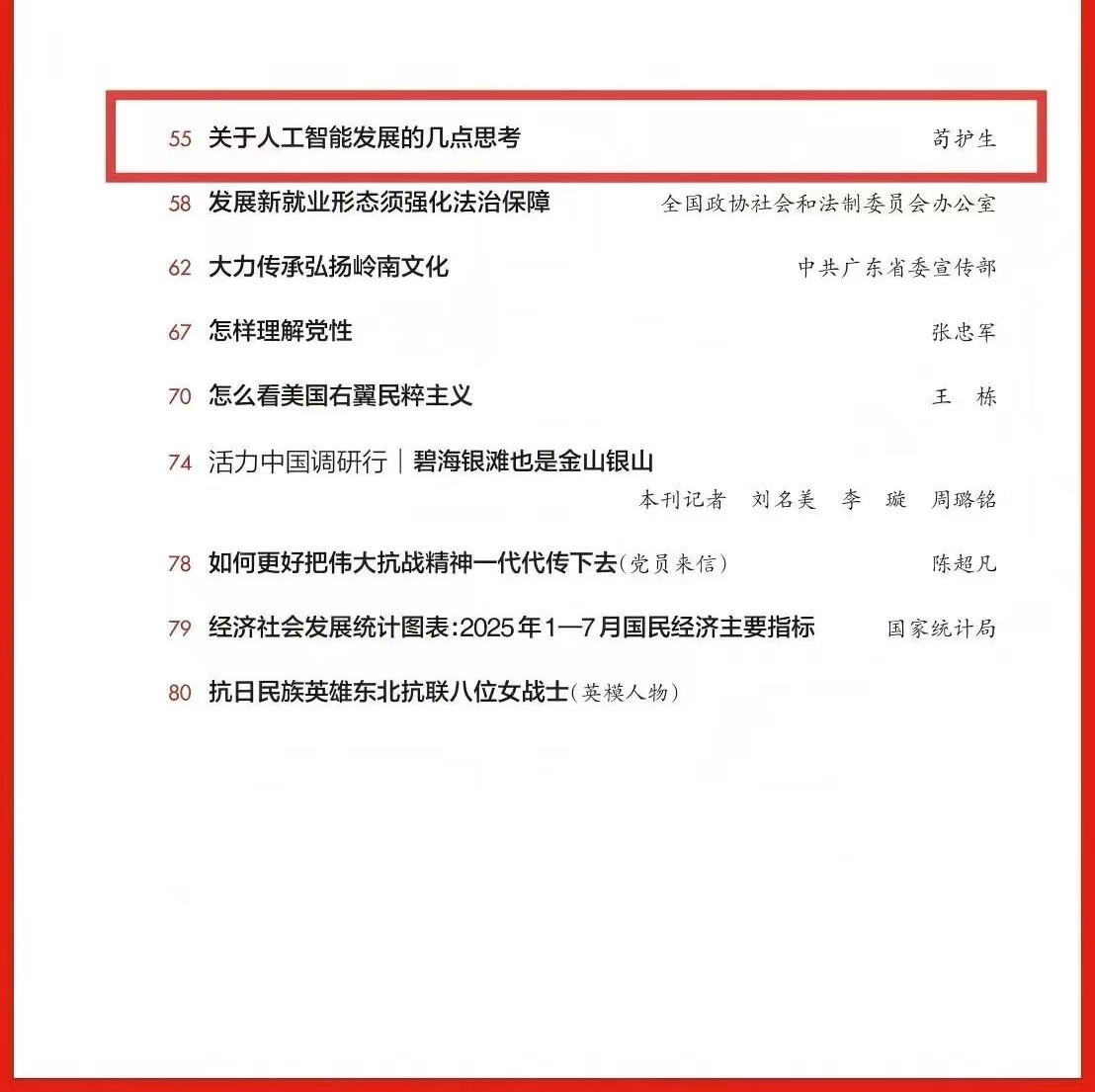 編者按:9月1日出版的2025年第17期《求是》雜志刊發(fā)公司黨委書記、董事長茍護(hù)生同志理論文章《關(guān)于人工智能發(fā)展的幾點(diǎn)思考》,文章立足全球人工智能發(fā)展浪潮,緊扣我國人工智能產(chǎn)業(yè)實(shí)際,以辯證思維深入剖析創(chuàng)新與開放、發(fā)展與安全、政府與市場、應(yīng)用與治理的內(nèi)在邏輯關(guān)系,在搶抓人工智能發(fā)展機(jī)遇、直面技術(shù)應(yīng)用風(fēng)險(xiǎn)挑戰(zhàn)中,為推動(dòng)人工智能與經(jīng)濟(jì)社會(huì)深度融合、助力我國搶占全球科技競爭主動(dòng)權(quán)提供了有益借鑒。現(xiàn)予以轉(zhuǎn)載,供學(xué)習(xí)參考。 關(guān)于人工智能發(fā)展的幾點(diǎn)思考 茍護(hù)生 近年來,以大模型為代表的人工智能迎來新的發(fā)展浪潮,正以前所未有的速度深入滲透經(jīng)濟(jì)社會(huì)發(fā)展的方方面面,貼近每個(gè)人的生活和工作,深刻重構(gòu)著人類社會(huì)生產(chǎn)力和文明形態(tài)。習(xí)近平總書記指出,人工智能是新一輪科技革命和產(chǎn)業(yè)變革的重要驅(qū)動(dòng)力量,將對全球經(jīng)濟(jì)社會(huì)發(fā)展和人類文明進(jìn)步產(chǎn)生深遠(yuǎn)影響。當(dāng)前,全球主要國家都在搶抓人工智能發(fā)展機(jī)遇。近日,國務(wù)院印發(fā)《關(guān)于深入實(shí)施“人工智能+”行動(dòng)的意見》,明確實(shí)施“人工智能+”行動(dòng)的總體要求、發(fā)展目標(biāo)和重點(diǎn)方向,為進(jìn)一步推動(dòng)人工智能與經(jīng)濟(jì)社會(huì)各行業(yè)各領(lǐng)域廣泛深度融合提供了方向指引。我們要深刻領(lǐng)會(huì)習(xí)近平總書記關(guān)于人工智能的重要論述,把握好創(chuàng)新與開放、發(fā)展與安全、政府與市場、應(yīng)用與治理的辯證關(guān)系,立足產(chǎn)業(yè)發(fā)展需求,順應(yīng)治理變革趨勢,走出一條具有中國特色的人工智能發(fā)展之路。 自主創(chuàng)新與開放合作的辯證統(tǒng)一。習(xí)近平總書記強(qiáng)調(diào),“自主創(chuàng)新是開放環(huán)境下的創(chuàng)新”。這一重要論斷為處理好人工智能技術(shù)自主與全球化協(xié)作提供了根本遵循。 自主創(chuàng)新是人工智能發(fā)展的“根”,沒有核心技術(shù)的自主化,開放合作就可能淪為“依附式發(fā)展”,在關(guān)鍵領(lǐng)域受制于人。2018年以來,面對美國對人工智能和芯片等高技術(shù)產(chǎn)業(yè)的嚴(yán)密封鎖和瘋狂打壓,我國始終堅(jiān)持自主創(chuàng)新,在芯片結(jié)構(gòu)、核心算法等底層技術(shù)領(lǐng)域?qū)崿F(xiàn)突破,初步構(gòu)建了自主化的產(chǎn)業(yè)生態(tài)。例如,深度求索公司通過自主優(yōu)化算法架構(gòu),用遠(yuǎn)低于國際同類產(chǎn)品的成本,達(dá)到了相近的性能水平。再如,我國企業(yè)在激光雷達(dá)、高精度地圖等關(guān)鍵環(huán)節(jié)的自主創(chuàng)新,讓我國躋身自動(dòng)駕駛領(lǐng)域領(lǐng)先國家。這些技術(shù)的突破離不開我國良好的自主創(chuàng)新條件。國內(nèi)超大規(guī)模市場是人工智能技術(shù)落地與迭代的“試驗(yàn)場”,我國擁有全球最大的數(shù)字經(jīng)濟(jì)市場,為人工智能應(yīng)用提供了豐富場景;國內(nèi)完整的產(chǎn)業(yè)鏈體系,為人工智能技術(shù)的自主發(fā)展提供了有效支撐。 自主創(chuàng)新并非“閉門造車”,堅(jiān)持開放合作才能緊跟科技發(fā)展方向,避免裹足不前或淪為“技術(shù)孤島”。在基礎(chǔ)研究領(lǐng)域,全球開源社區(qū)貢獻(xiàn)的TensorFlow、PyTorch等深度學(xué)習(xí)框架,為我國人工智能創(chuàng)新提供了底層支撐,我國也依靠大模型的開源生態(tài),打破了美國科技巨頭的封閉系統(tǒng)壟斷,為全球人工智能發(fā)展提供了中國解決方案。在高端人才方面,全球頂尖人工智能研究者分布具有分散性,需要通過國際交流集聚智慧。人工智能治理是全球性的挑戰(zhàn),需要各國攜手共進(jìn)。在大國科技博弈加劇的背景下,國際人工智能治理呈現(xiàn)多極化競爭與碎片化合作并存、技術(shù)標(biāo)準(zhǔn)爭奪與倫理價(jià)值博弈交織的復(fù)雜態(tài)勢。美國利用技術(shù)霸權(quán)塑造全球人工智能領(lǐng)導(dǎo)力,歐盟以立法監(jiān)管為導(dǎo)向鞏固在人工智能全球治理中的領(lǐng)導(dǎo)地位,我國則堅(jiān)持以開放合作的姿態(tài),主張通過“技術(shù)共享、能力共建”縮小數(shù)字鴻溝,并通過世界人工智能大會(huì)等國際平臺(tái)提出人工智能治理方略,為全球人工智能治理提供有益參考。 7月26日至28日,2025世界人工智能大會(huì)暨人工智能全球治理高級別會(huì)議在上海舉辦。“智能時(shí)代 同球共濟(jì)”的主題貫穿始終,為全球人工智能領(lǐng)域帶來一場思想與創(chuàng)新碰撞的盛宴。圖為參觀者在中國南方電網(wǎng)展區(qū)拍攝“悟空”帶電作業(yè)機(jī)器人。 新華社記者 陳浩明/攝 實(shí)踐表明,自主創(chuàng)新是開放合作的根基,開放合作是自主創(chuàng)新的助力,唯有將二者有機(jī)結(jié)合,才能讓人工智能在安全可控的前提下釋放最大價(jià)值。我國人工智能發(fā)展,必須堅(jiān)持自主創(chuàng)新與開放合作的辯證統(tǒng)一,通過國內(nèi)市場的“厚度”支撐技術(shù)創(chuàng)新的“