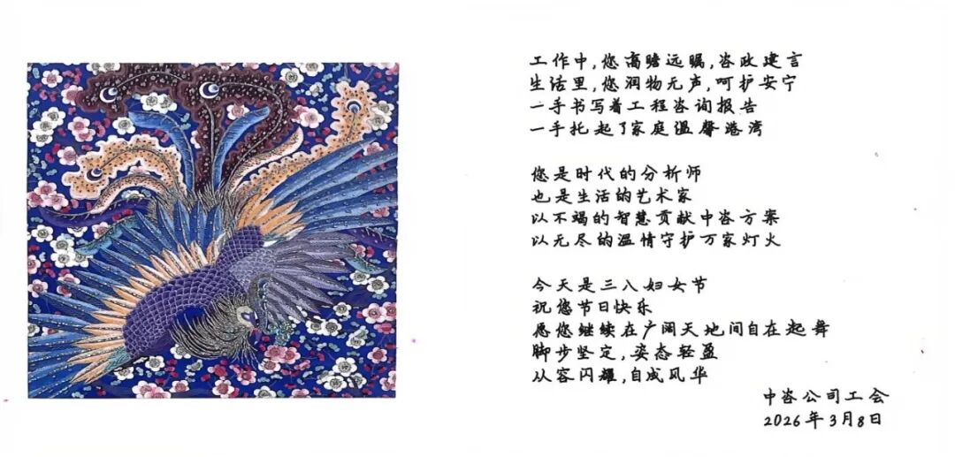 活動開始前,工會特別為女職工定制了“有鳳來儀”和“春暖花開”兩款精美賀卡。前者取意“有鳳來儀,非梧不棲”,贊美女職工如鳳凰般高貴典雅、才華出眾;后者寓意春回大地、萬物復(fù)蘇,祝愿每一位女職工生活如春花般絢爛美好。手寫的祝福語,一筆一畫間流淌著真摯情誼:“工作中,您高瞻遠(yuǎn)矚,咨政建言;生活里,您潤物無聲,呵護(hù)安寧;您是時(shí)代的分析師,也是生活的藝術(shù)家,以不竭的智慧貢獻(xiàn)中咨方案,以無盡的溫情守護(hù)萬家燈火。”