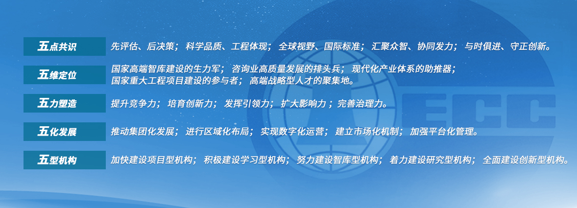 中咨公司牢記初心使命,以習近平新時代中國特色社會主義思想為指導,落實中央加強中國特色新型智庫建設和促進咨詢業高質量發展的要求,公司正按照錨定發展目標、夯實發展基礎、調整發展姿態、突出發展特點、取得發展成效的“五五戰略”,立足“五點”認識,強化“五維”定位,聚焦“五力”提升,推動“五化”發展,建設“五型”機構,全力推進國家高端智庫和世界一流咨詢機構建設。